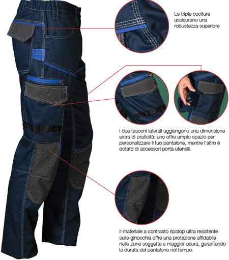 - Le triple cuciture del pantalone da lavoro assicurano una robustezza superiore